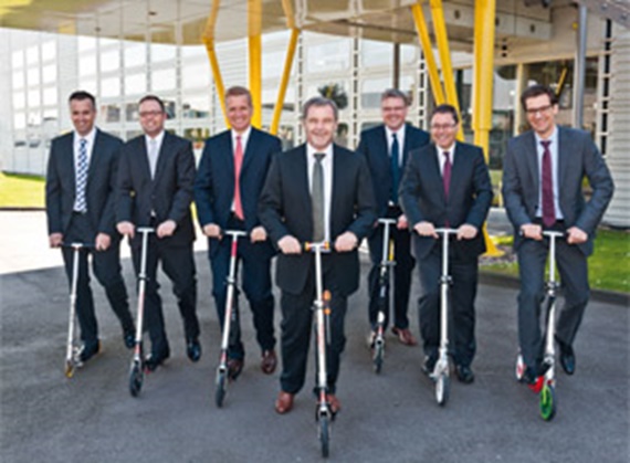 f.v.t.h.: Tobias Vogel, chef försäljning & marknadsföring lagerteknik; Michael Blaß, firmatecknare, chef försäljning & marknadsföring e-kedjesystem; Frank Blase, VD; Gerhard Baus, firmatecknare, chef för affärsområdet glidlager av plast; Artur Peplinski, firmatecknare, chef International Group Development & Marketing; Harald Nehring, firmatecknare, chef för affärsområdet e-kedjesystem; Christoph Müller, firmatecknare, ekonomi- och controllingchef