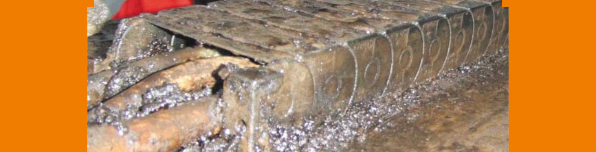 An asphalt finisher applies hot and cold bitumen mixtures. The e-chain® supplies the front area of the vehicle and is exposed to extreme dirt.