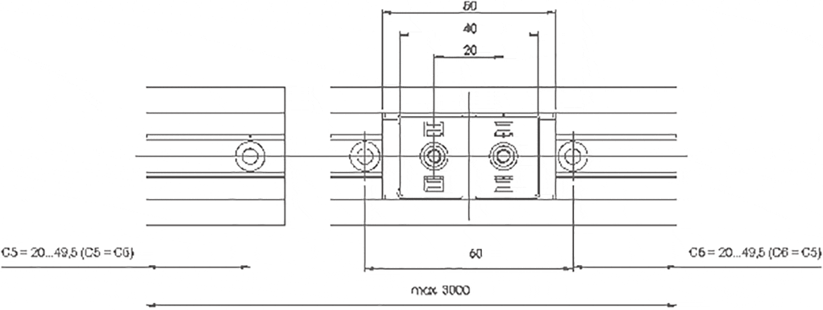 | Beställningsnr. | Max. skenlängder | a | C4 | A3 | C5=C6 | h | h1 | K1* | ly | lz | Skenvikt | Pris / m | ||