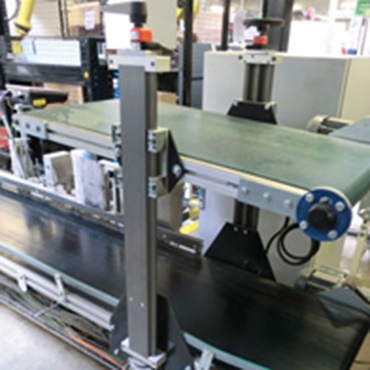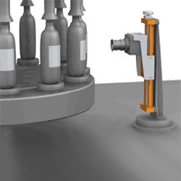 Användning i glasindustrin. Formatjustering på transportband för separering av flaskor.