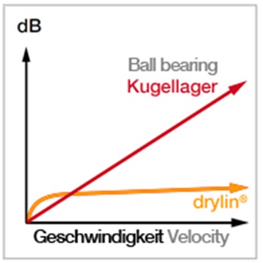 Även driften blir avsevärt tystare med funktionsprincipen "glida istället för att rulla". Ingen mekanisk avrullning av hårda motgående material, inga höga driftljud förorsakade av sammanstötning mellan kulorna.
